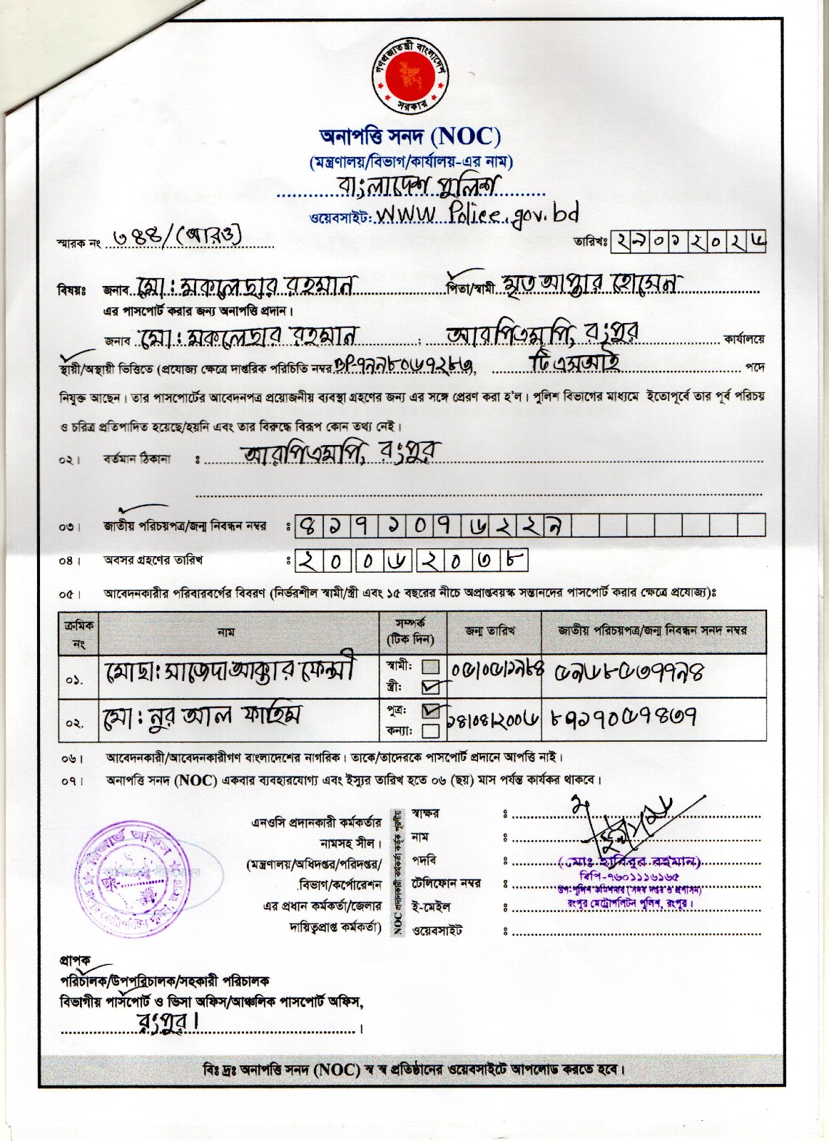 মোঃ মখলেছার রহমান NOC